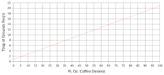 The graph is based on the two data points given in the Starbucks directions… 2 tbsp for 6 oz, and 14 tbsp for an 11 cup pot. I make the assumption that a 11 cup pot refers to a 66 fl. oz. pot, as it seems like most manufacturers use 6 fl. oz. as their cup size (based on a Google search). Note that the graph shows that zero cups of coffee still require some grounds (.8 tbsp). This doesn’t make sense, and indicates that the relationship is actually non-linear.